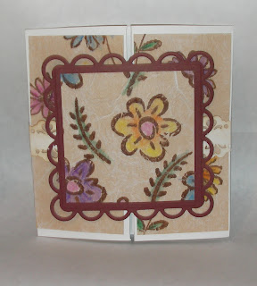 The background is made with white tissue paper on tan card stock. I then stamped the flowers with Vintage Photo Distress Ink and colored them in with water color pencils and blended with water. This card is held closed with a punched border strip that has small pieces of Velcro on the back.